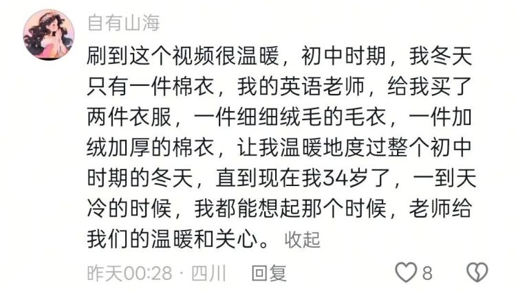 拍摄者配文称 :“孩子妈妈早年去世,爸爸奔波于生计,同事说孩子虽然成绩不太好,却总把温柔藏在细节里,每天一早到学校,都会默默给老师的暖瓶打满热水。老师看在眼里,记在心里,用一套新衣回应这份纯粹的美好。”